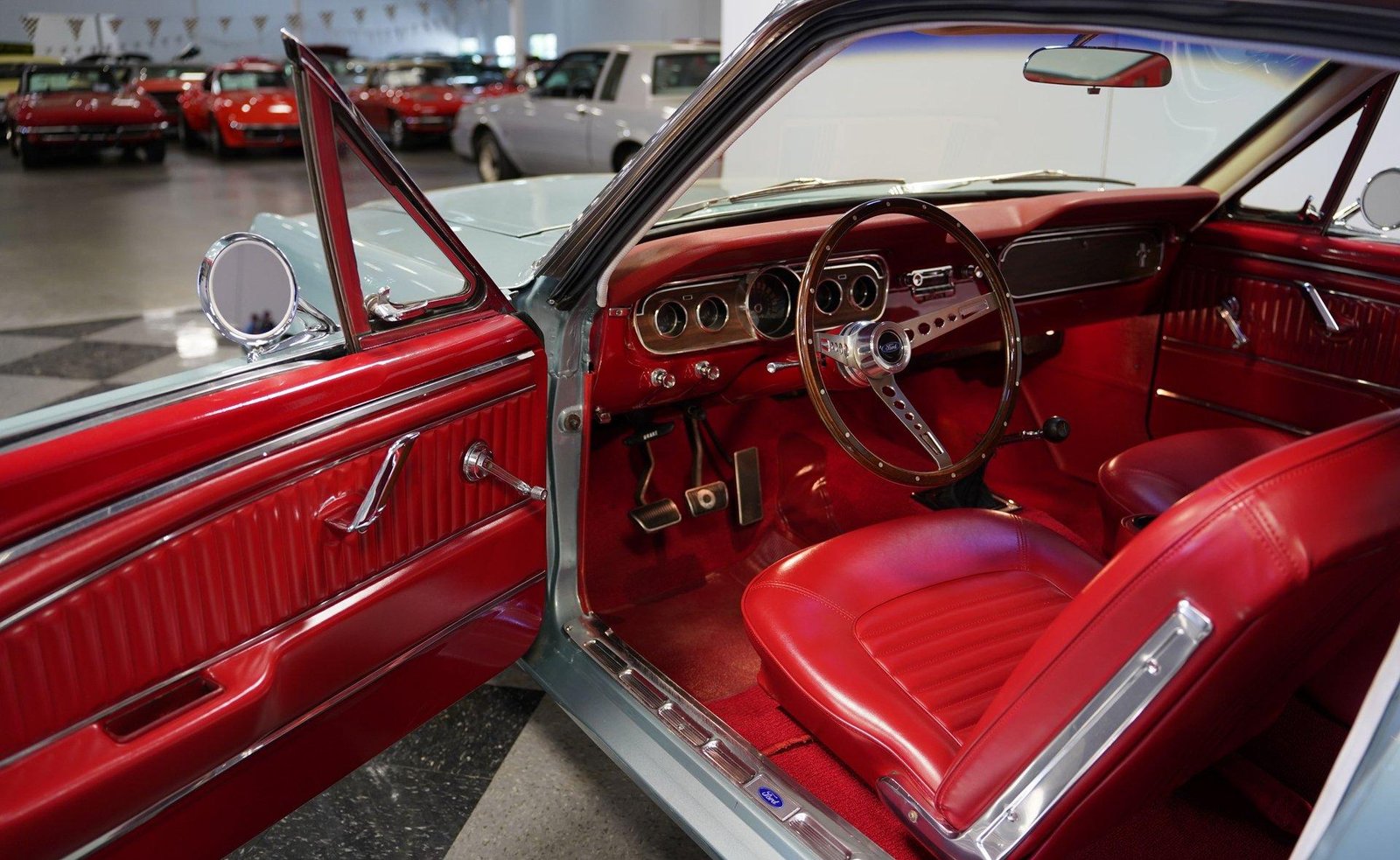 Interior: Vibrant red deluxe Pony interior with bucket seats, floor-mounted 4-speed shifter, classic gauge cluster, and AM/FM/AUX stereo system blending vintage looks with modern function.