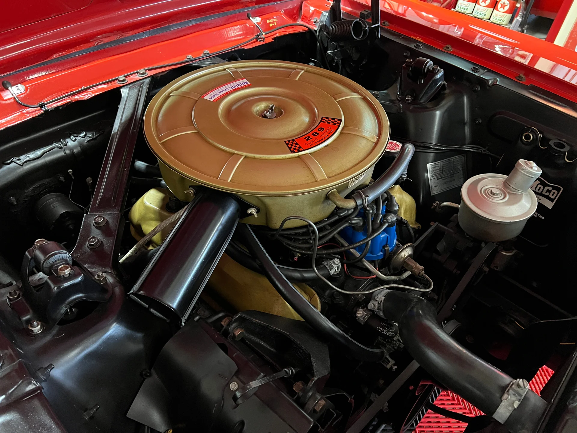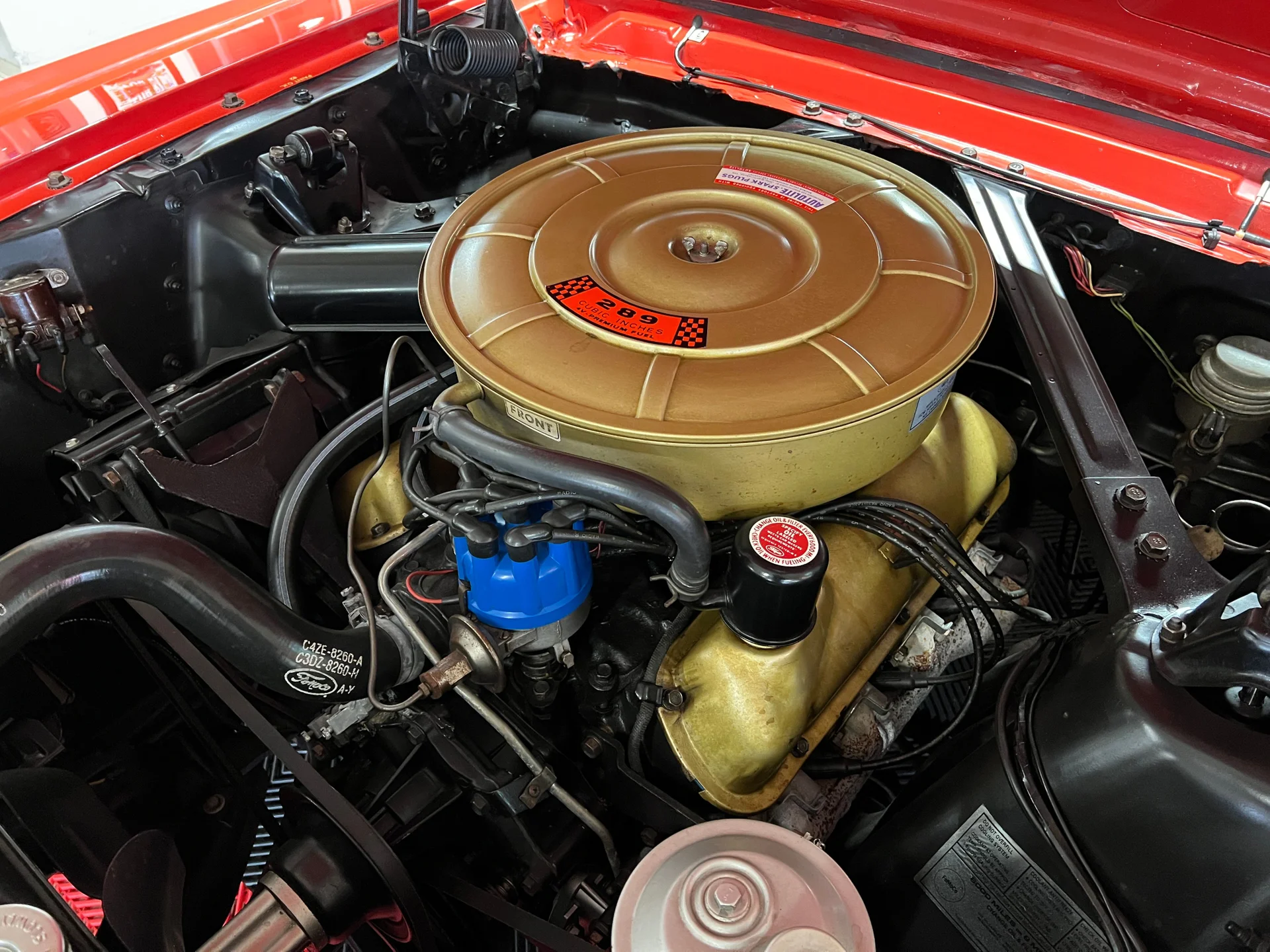 Original D-code 289ci V8 (210 HP) with Autolite 4-barrel carb, generator charging system, and factory-correct 64½ components. Paired to a C4 automatic and 3.00:1 rear differential. Manual drum brakes all around.