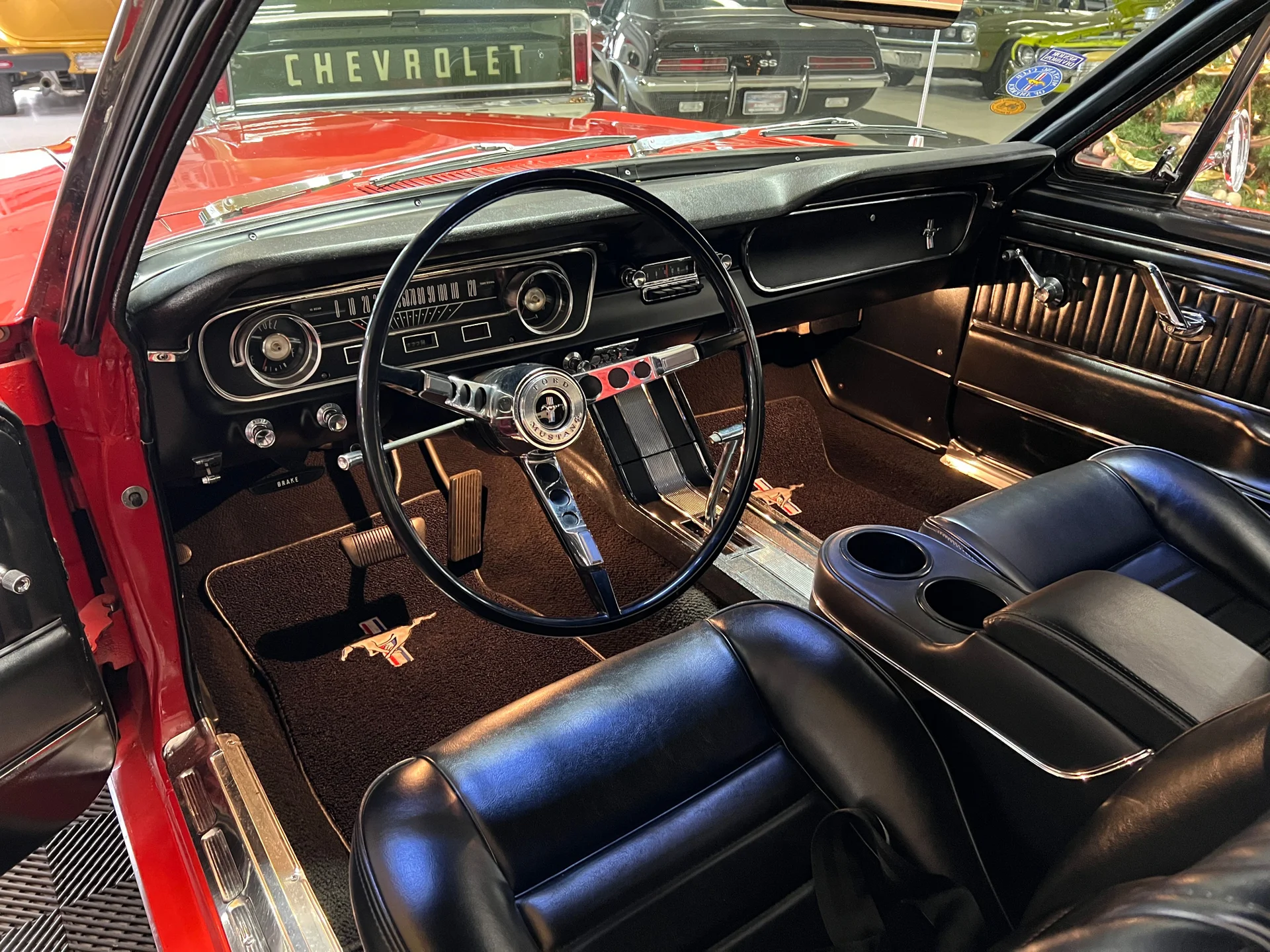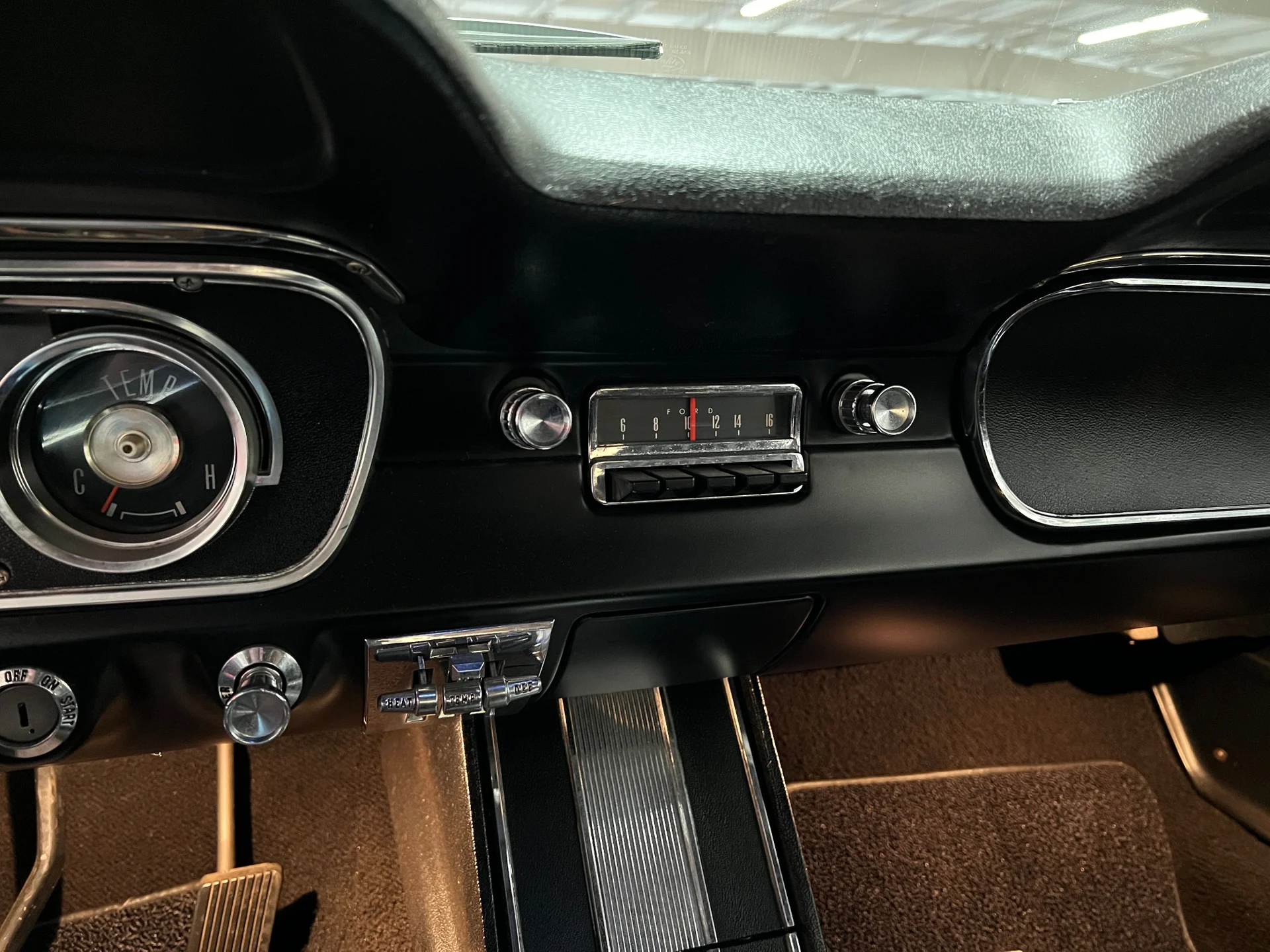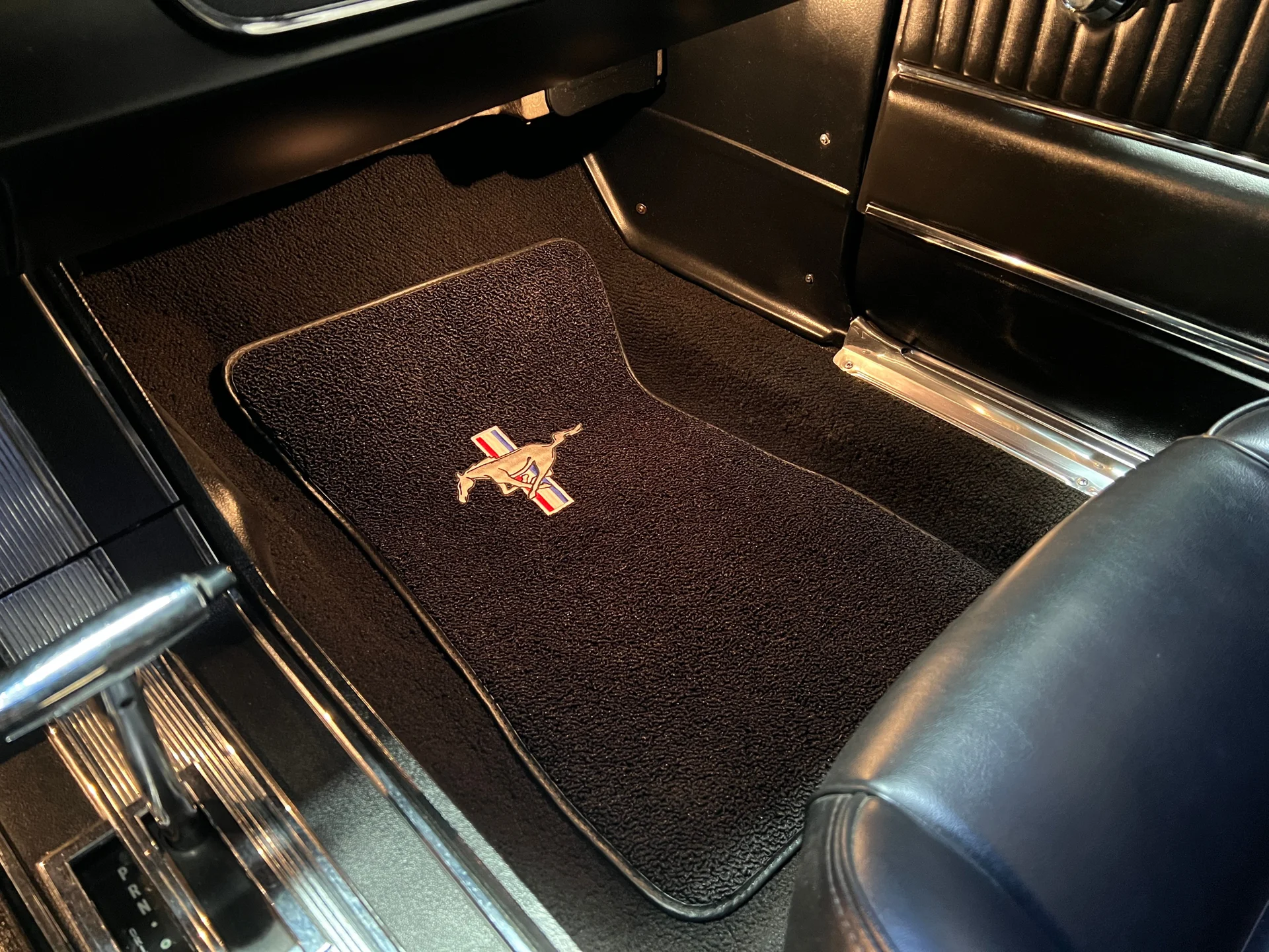 Like-new black Deluxe Pony interior (restored 2015), full-length console, working courtesy lights, crack-free dash, hidden AM/FM receiver, and excellent original-style details unique to early 64½ models. Odometer shows just 68,400 miles.