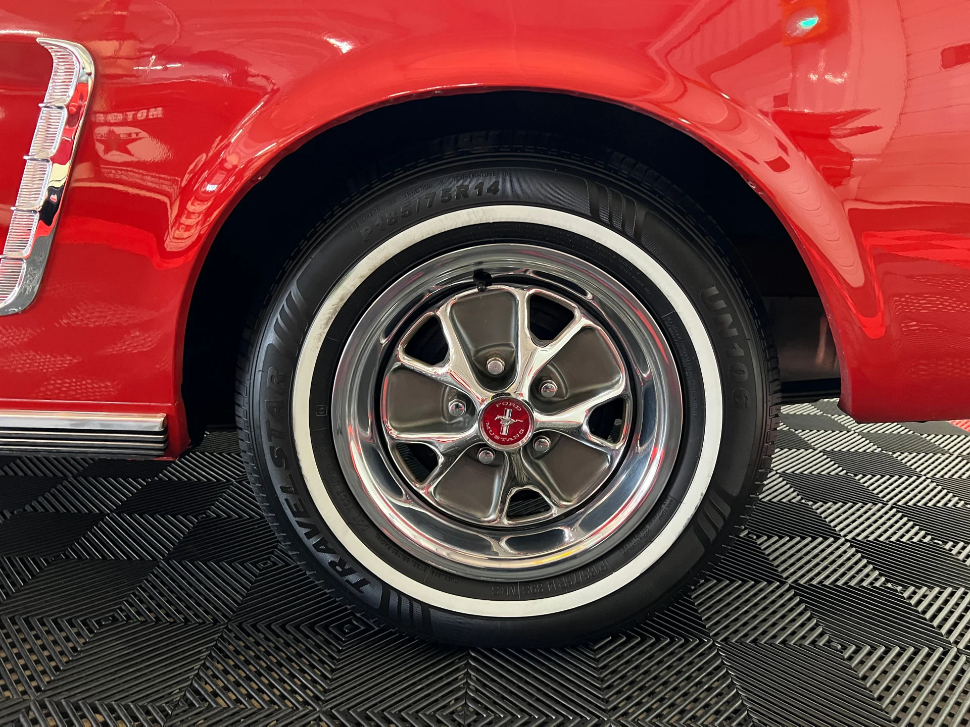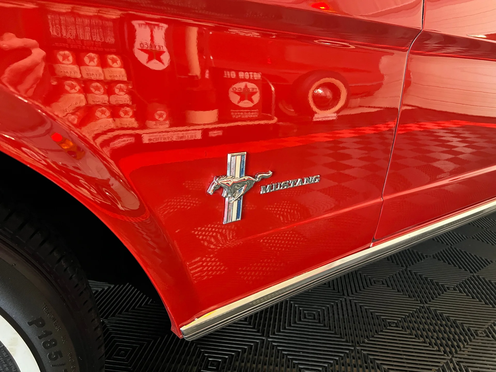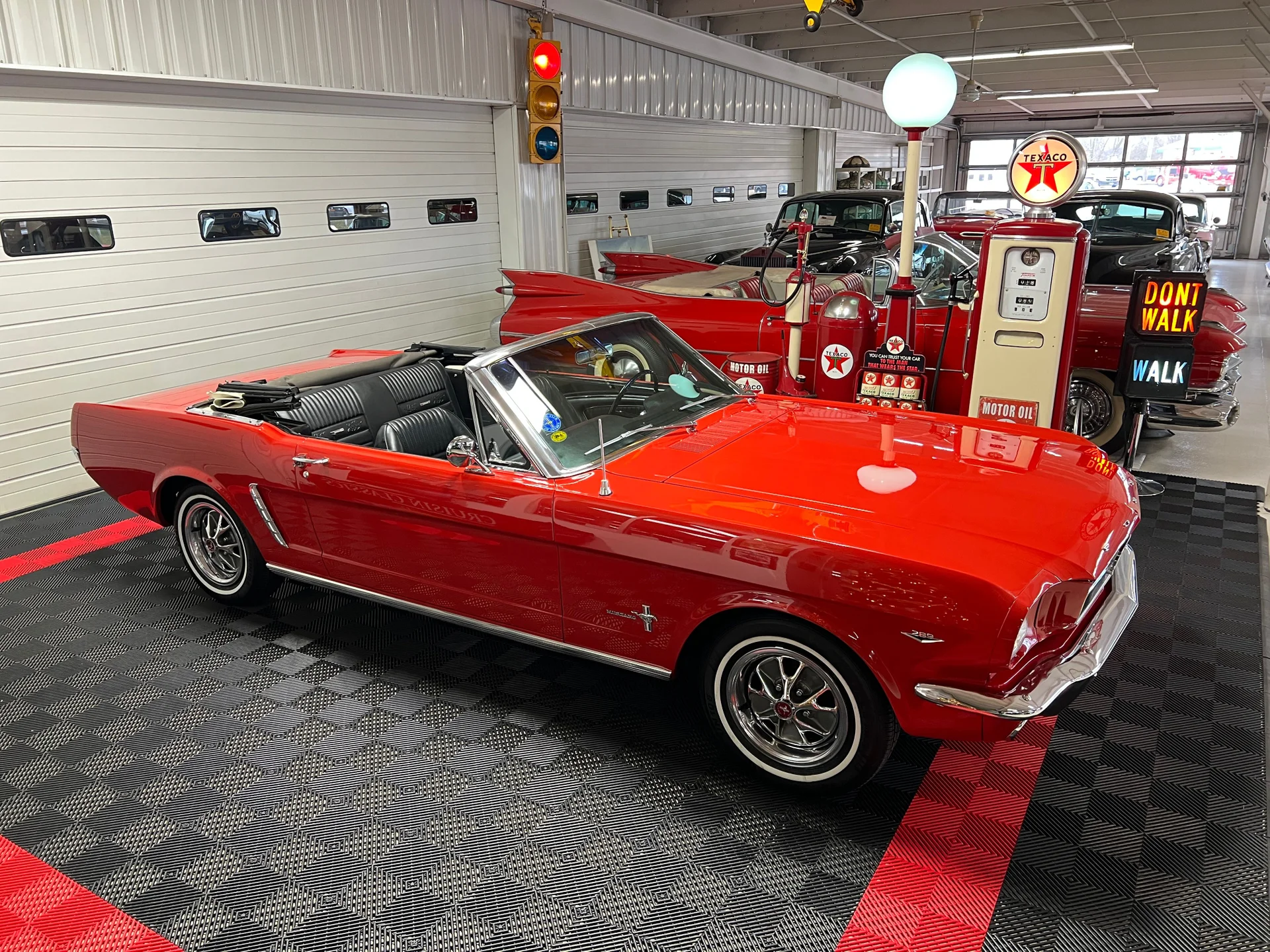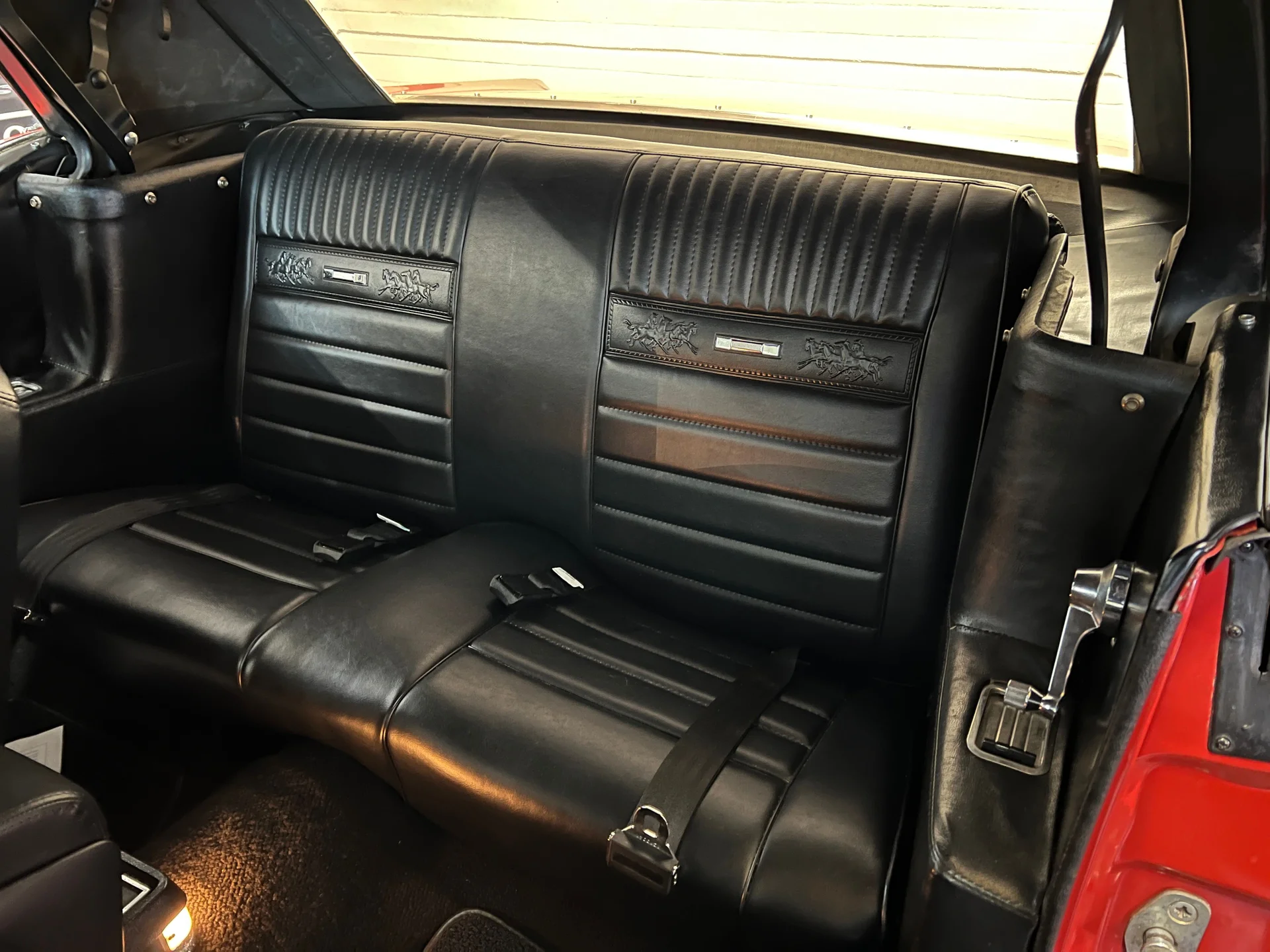Like-new black Deluxe Pony interior (restored 2015), full-length console, working courtesy lights, crack-free dash, hidden AM/FM receiver, and excellent original-style details unique to early 64½ models. Odometer shows just 68,400 miles.