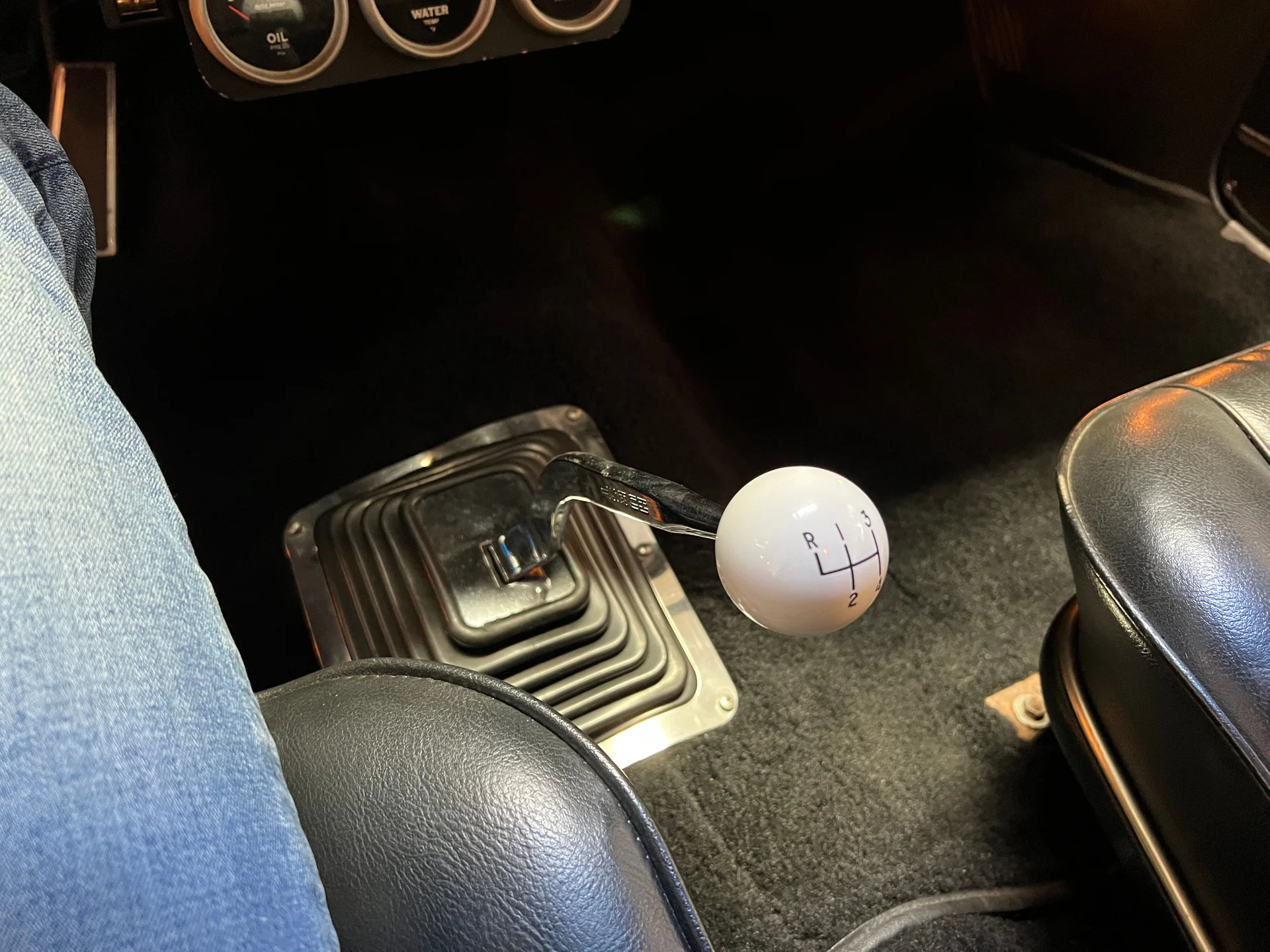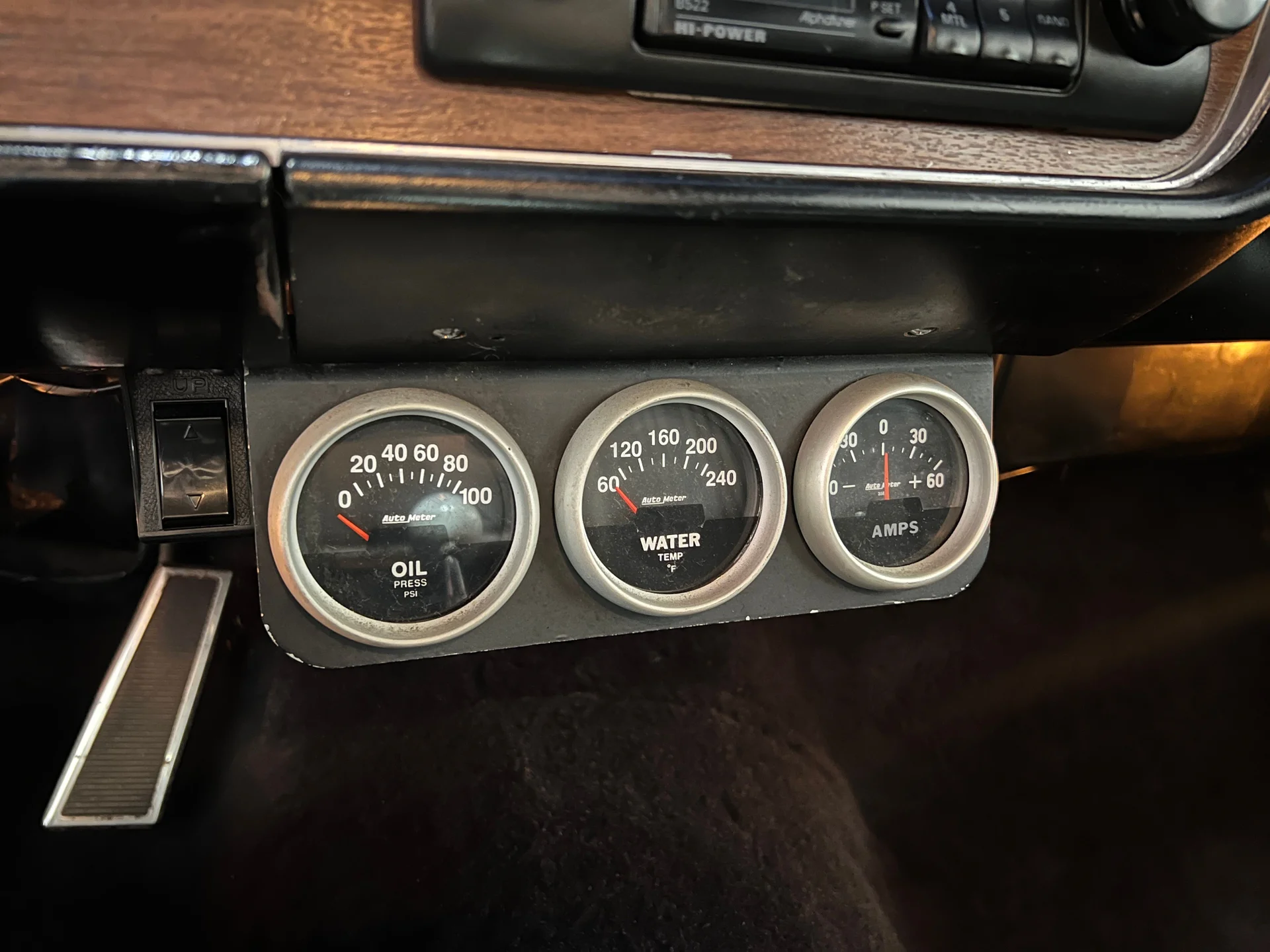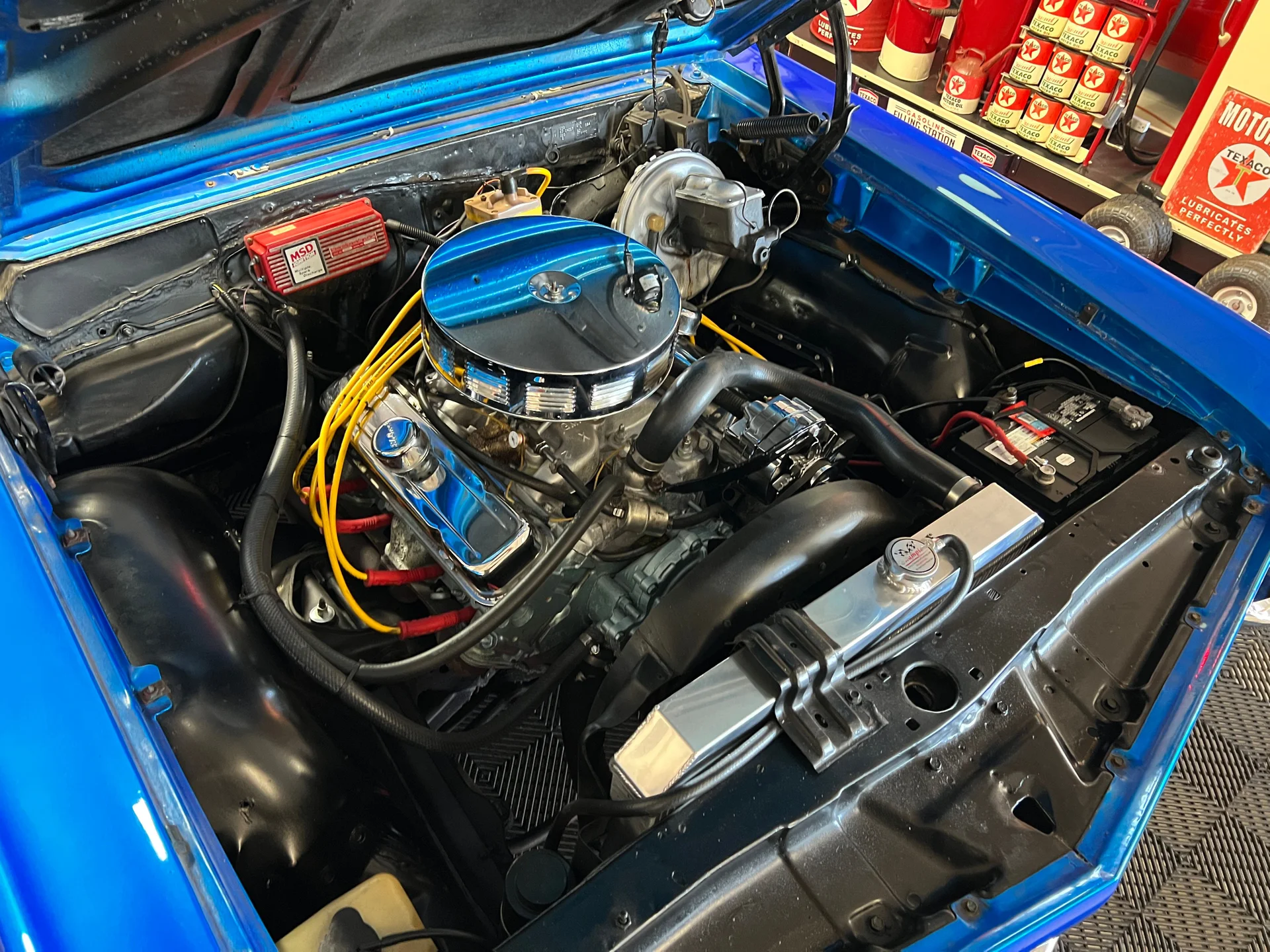 400ci V8 (’68 casting), Holley carb, MSD ignition, headers, aluminum radiator, and chrome dress-up components. Backed by a 4-speed manual with Hurst shifter and 10-bolt rear. Power front disc brakes with drilled/slotted rotors.