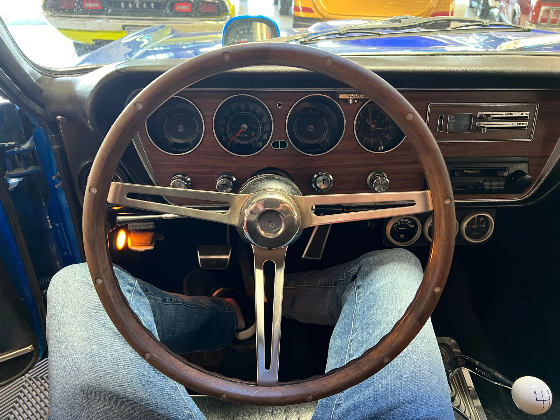 Black bucket-seat interior in good condition, wood steering wheel, power steering, under-dash AutoMeter gauges, and Panasonic AM/FM/Cassette stereo.