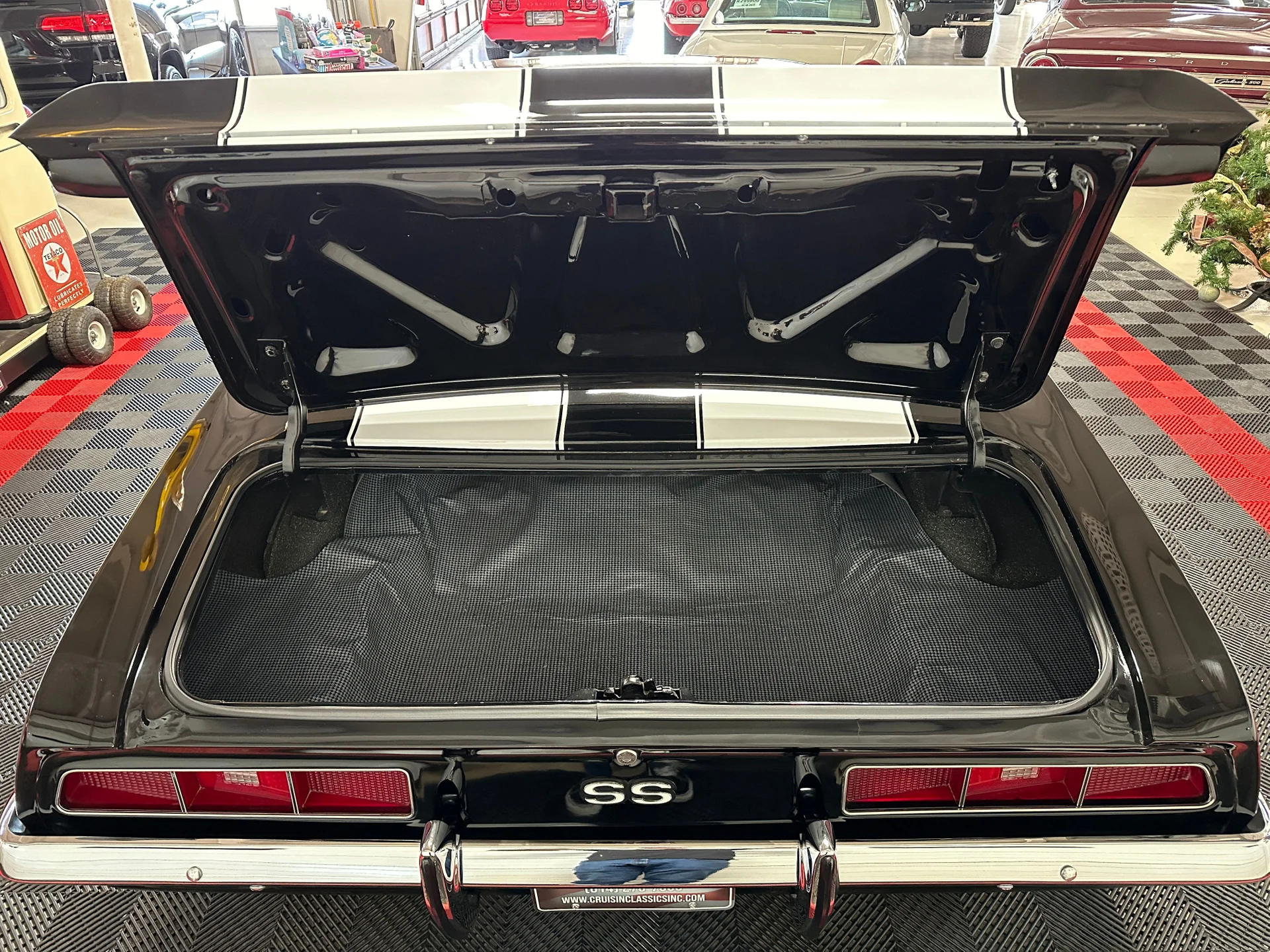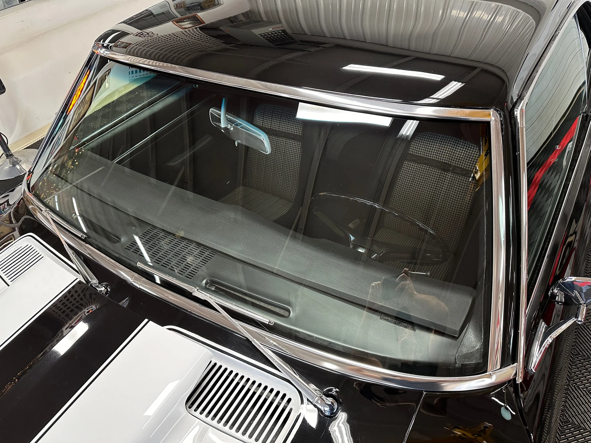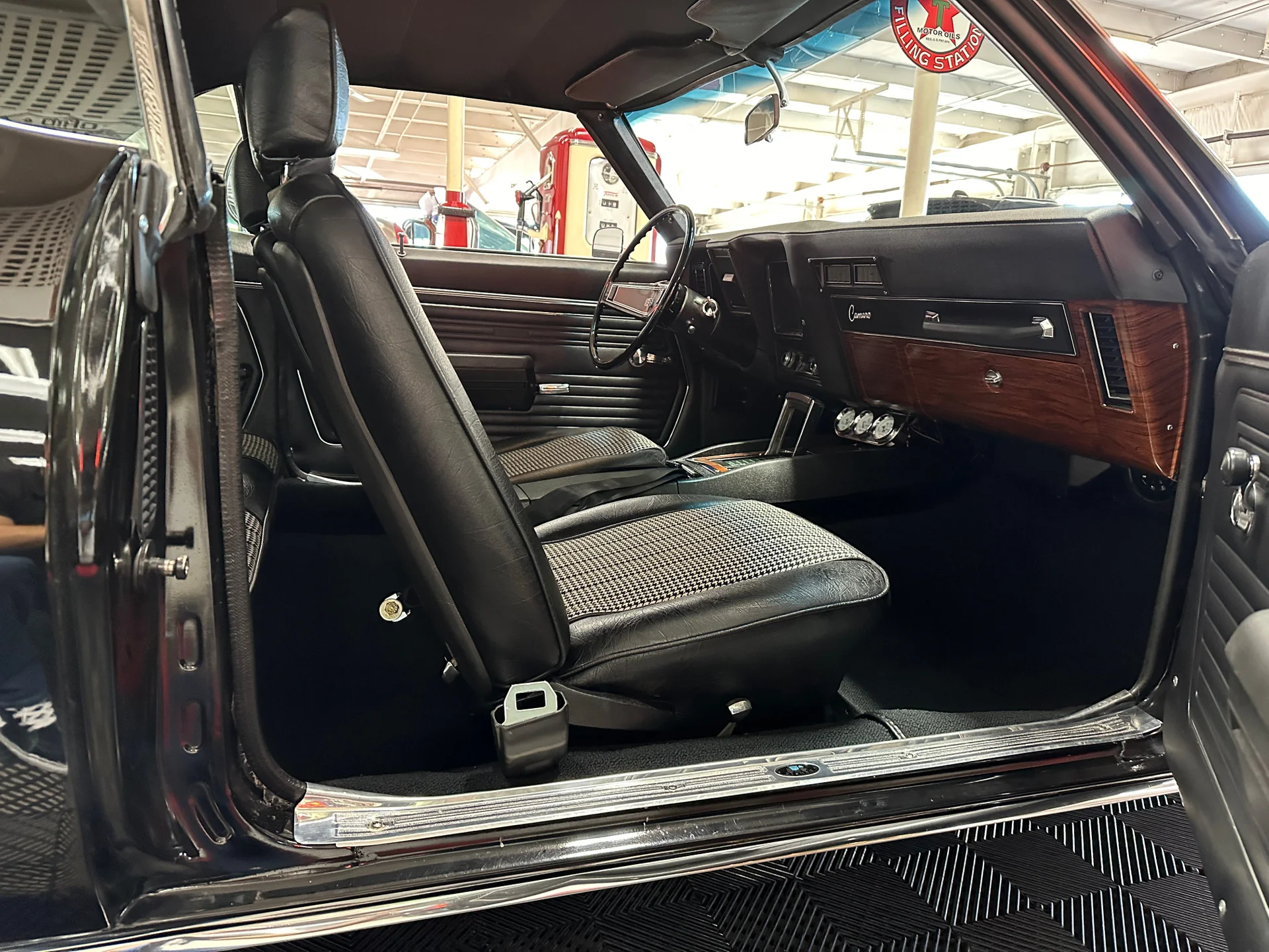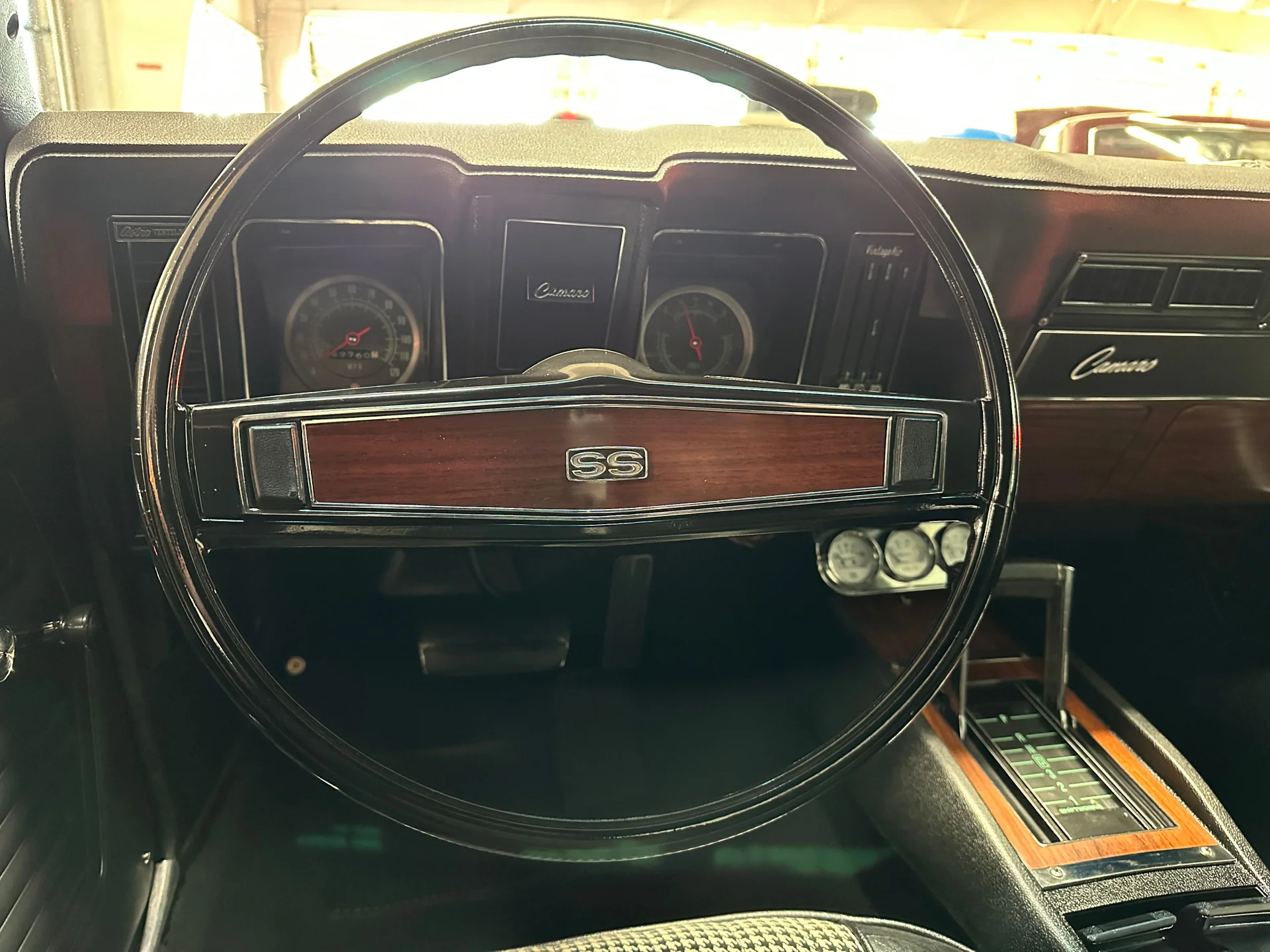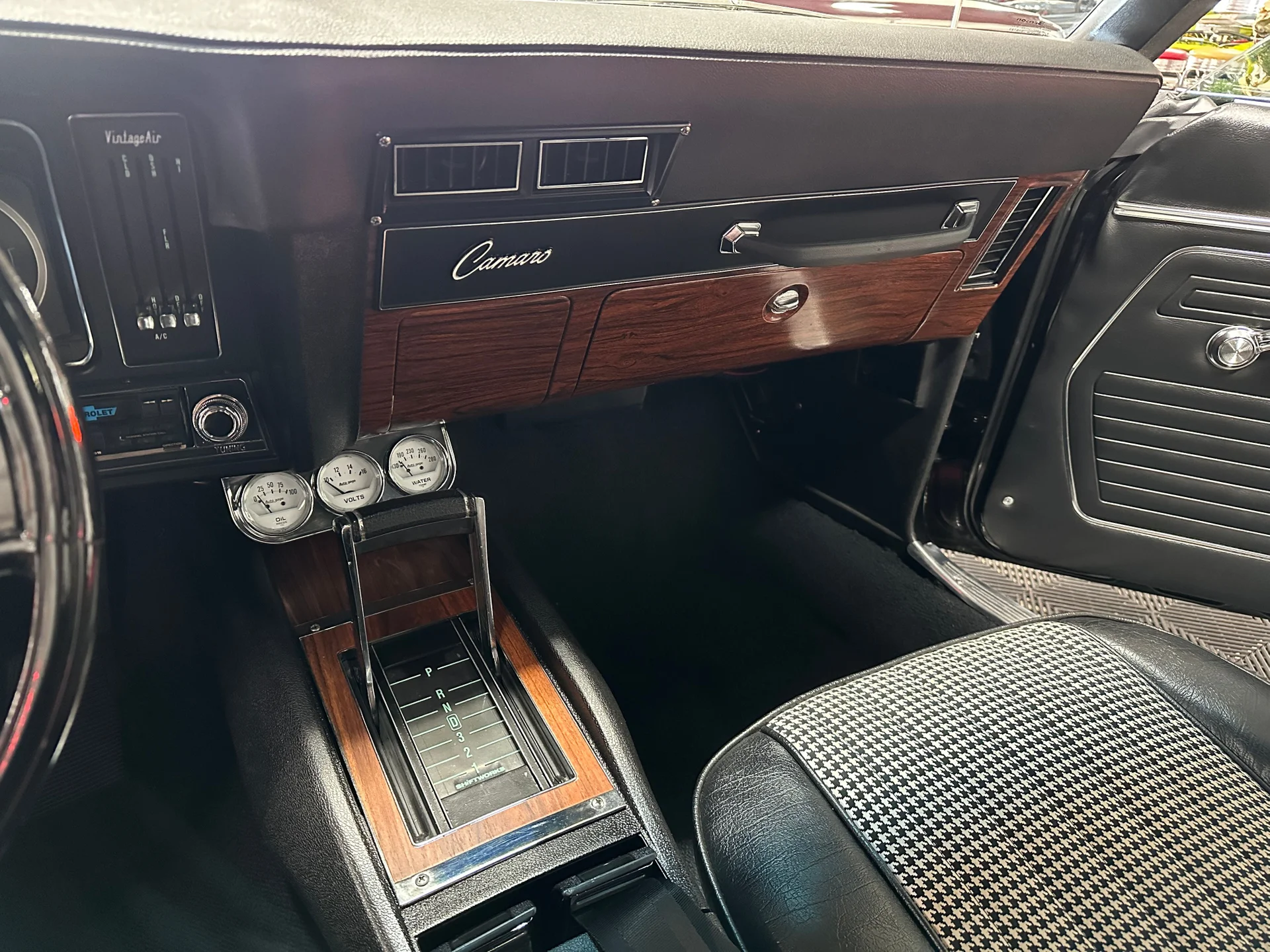 Black houndstooth buckets, new door panels, center console with horseshoe shifter, woodgrain trim, crack-free dash, new cluster, AutoGage auxiliary gauges, working Vintage Air A/C, Super Tuner III stereo, tight headliner, and clean trunk.