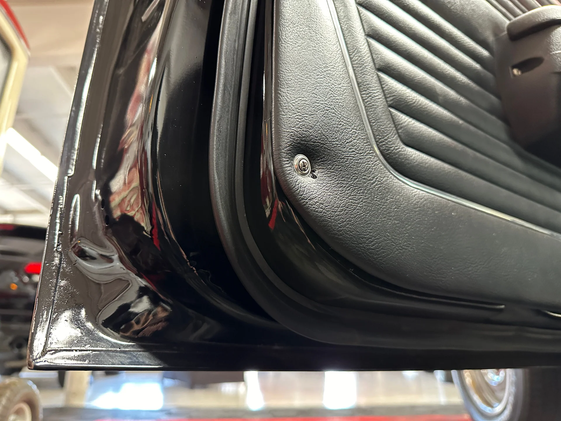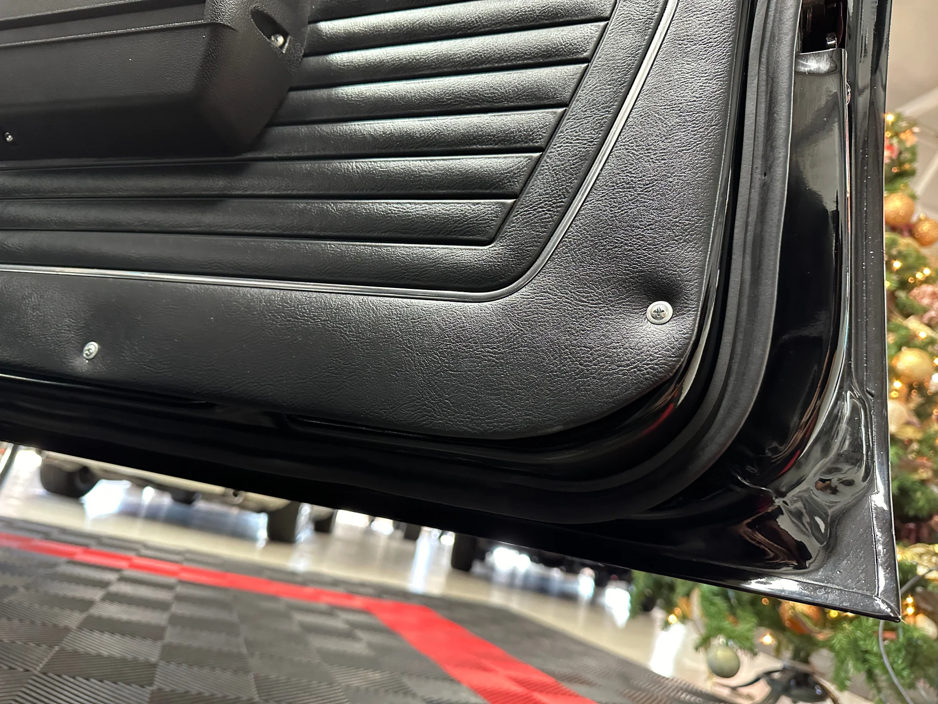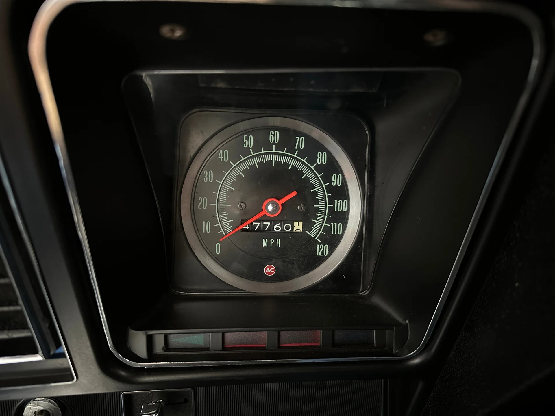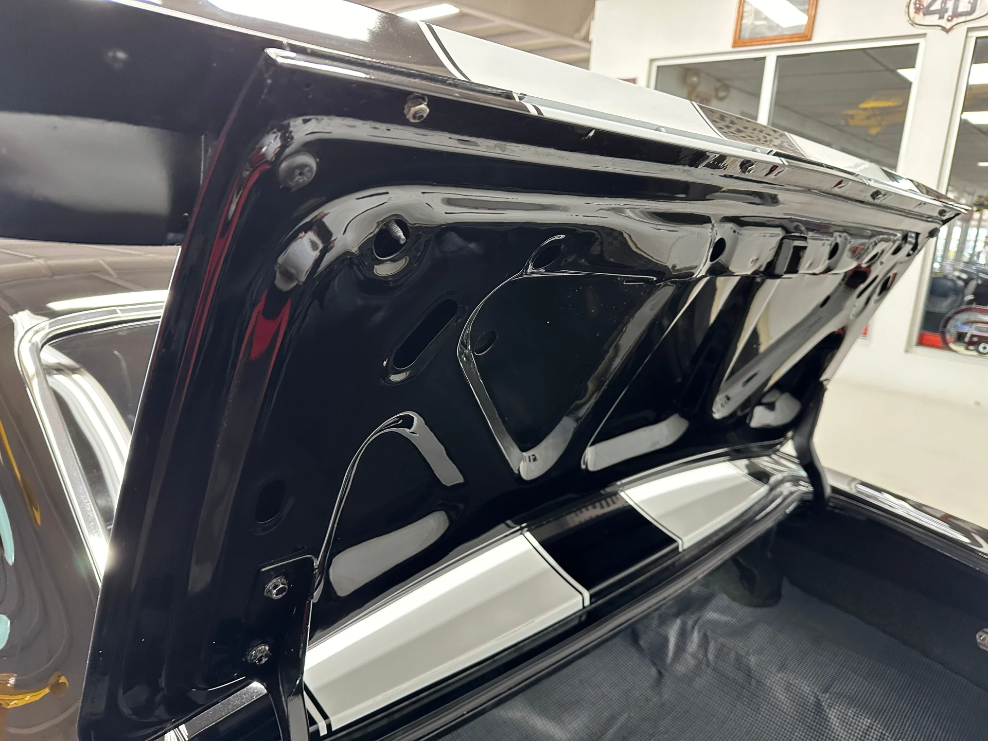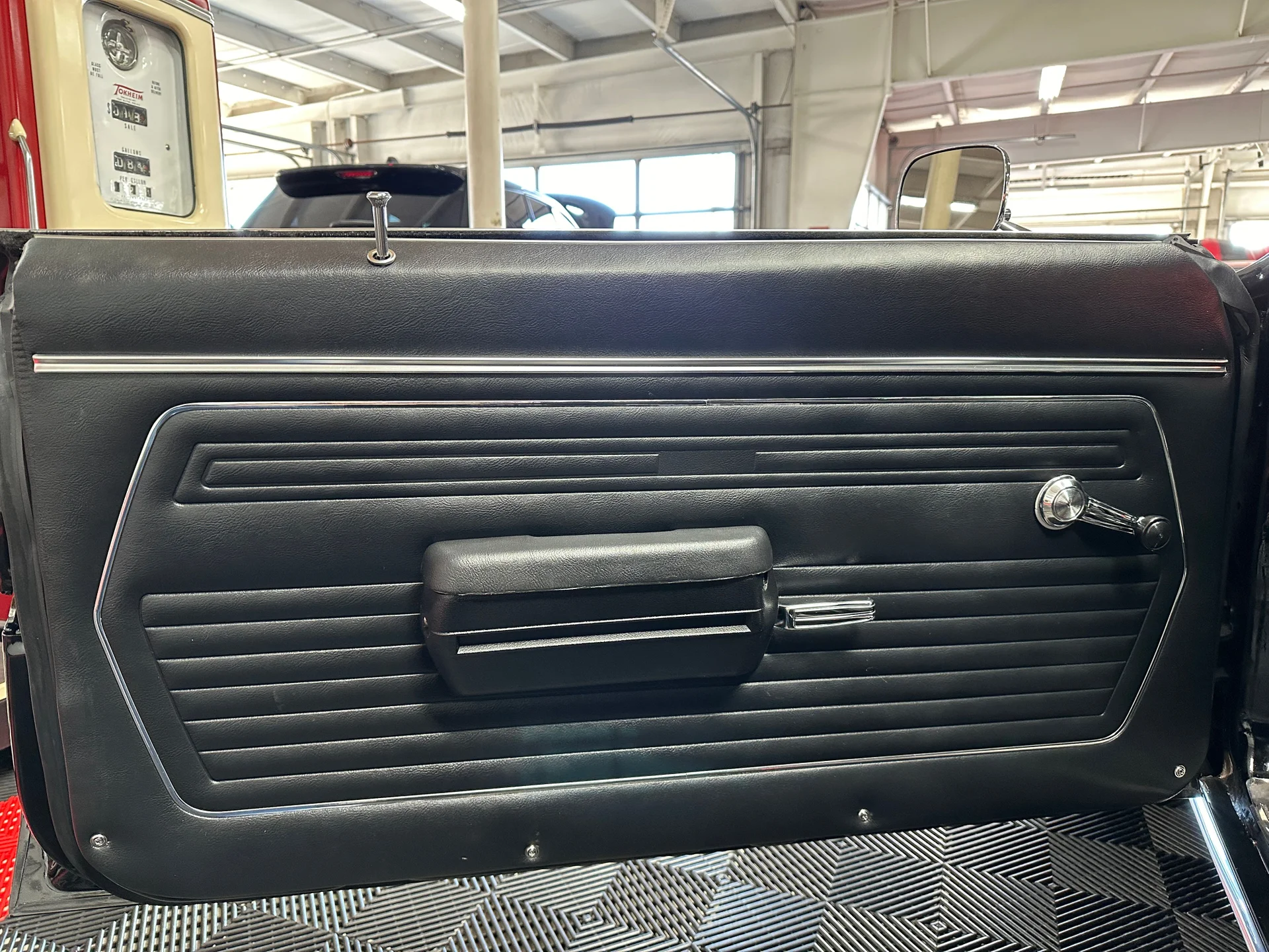 Black houndstooth buckets, new door panels, center console with horseshoe shifter, woodgrain trim, crack-free dash, new cluster, AutoGage auxiliary gauges, working Vintage Air A/C, Super Tuner III stereo, tight headliner, and clean trunk.