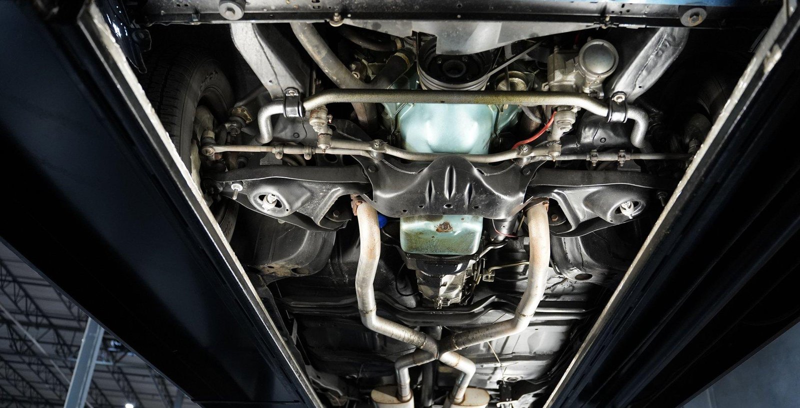 Exterior: Liberty Blue exterior, 15″ wheels wrapped in 245/60R15 tires, chrome bumpers and trim, clear hood tach, and well-detailed undercarriage reflecting careful restoration and maintenance.