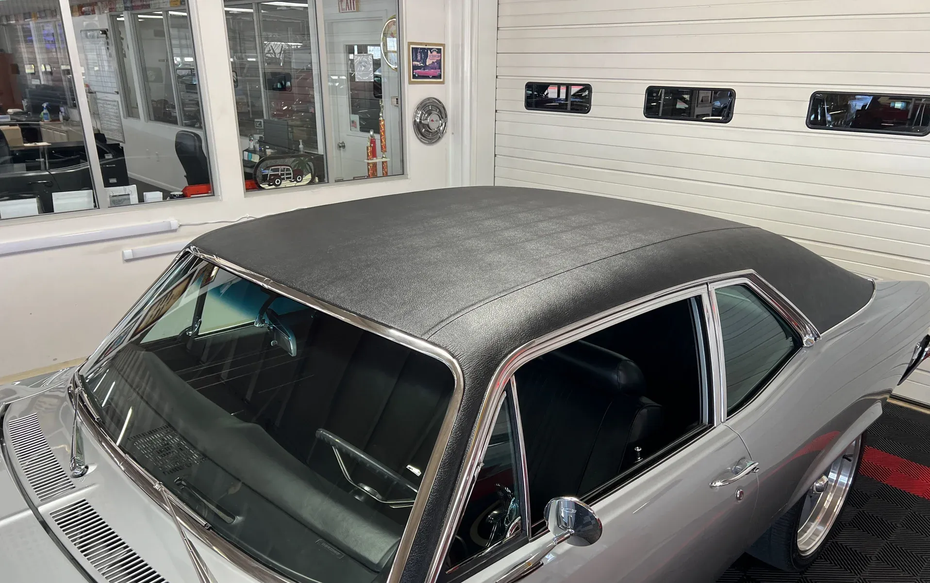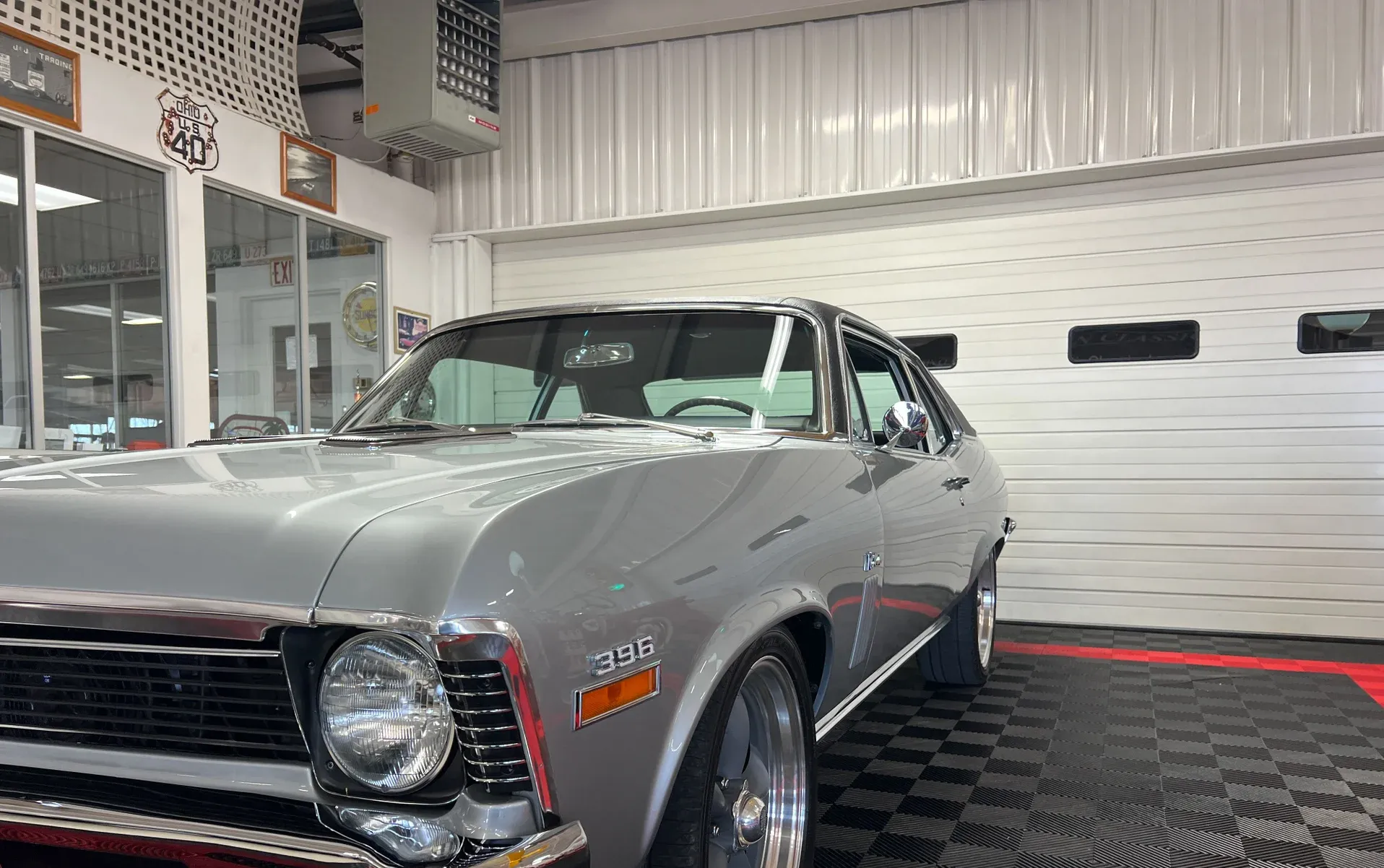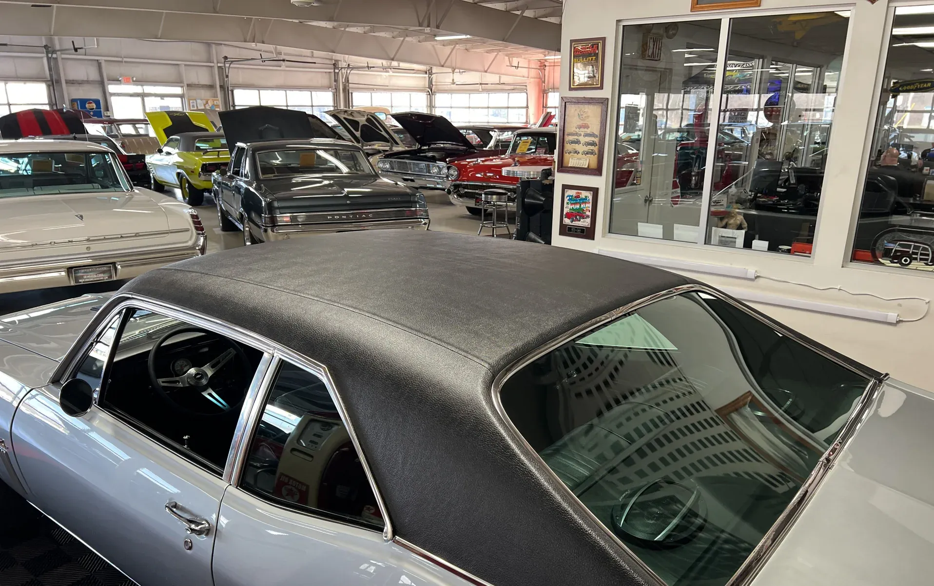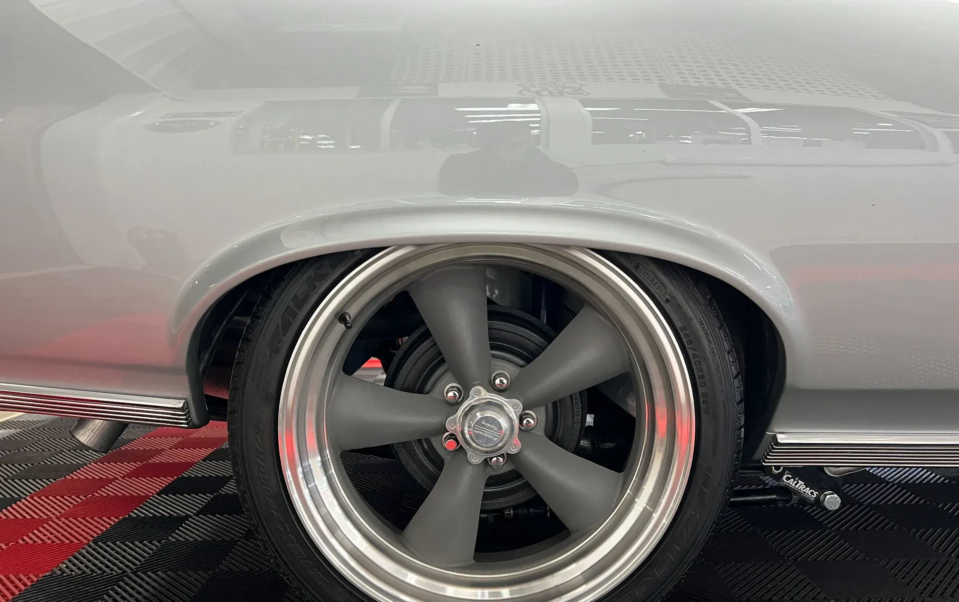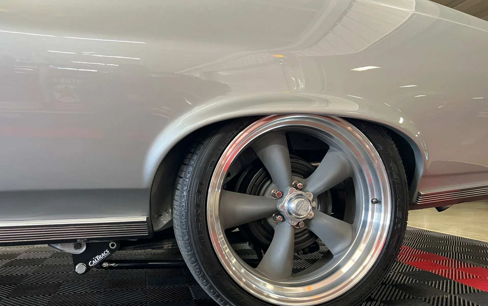 High-gloss Silver paint · Black vinyl top · Full frame-off rotisserie restoration · New chrome, trim, glass & bumpers · American Racing 18” front / 20” rear wheels · Falken radial tires · Lowered stance