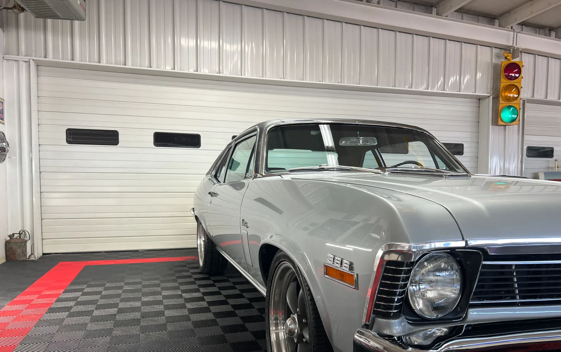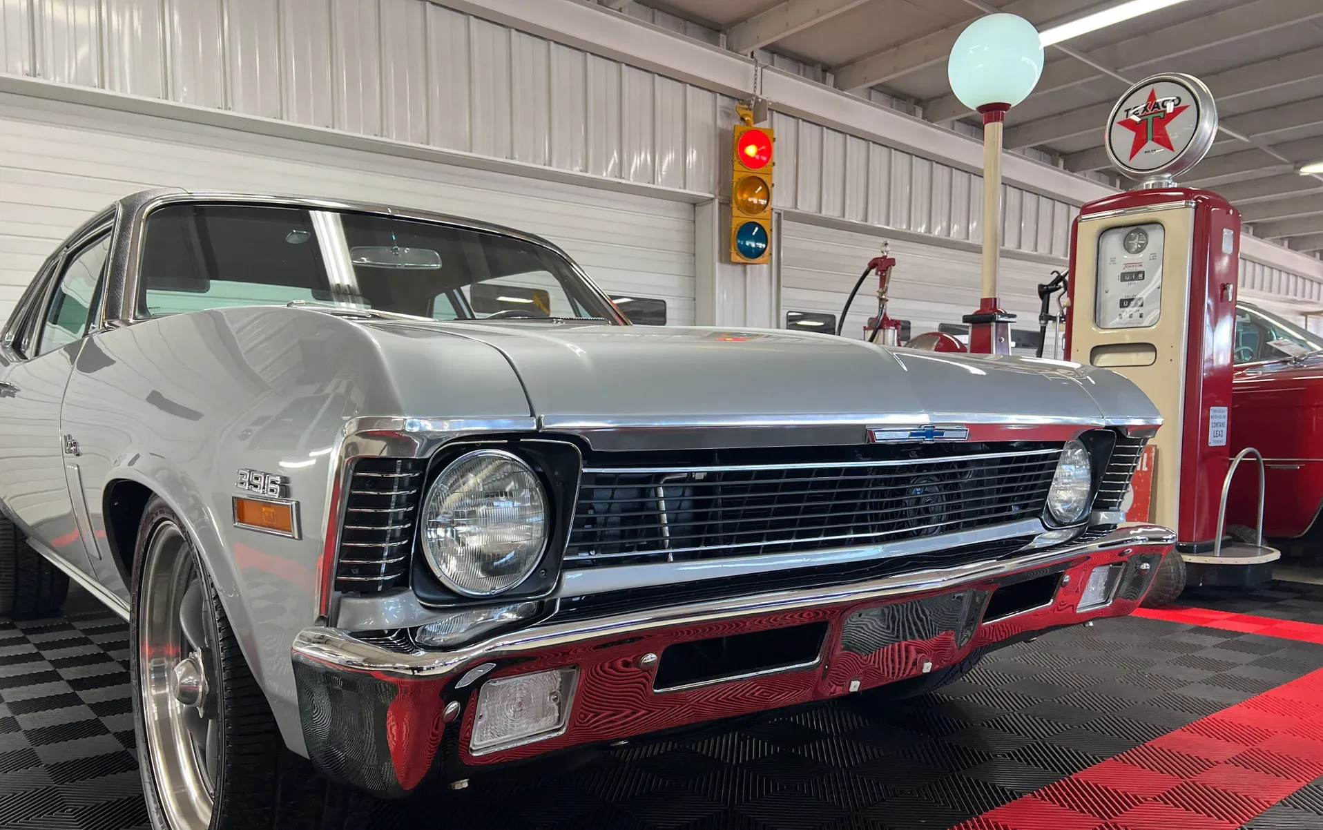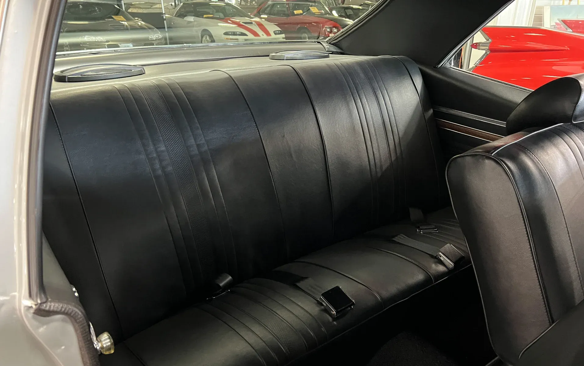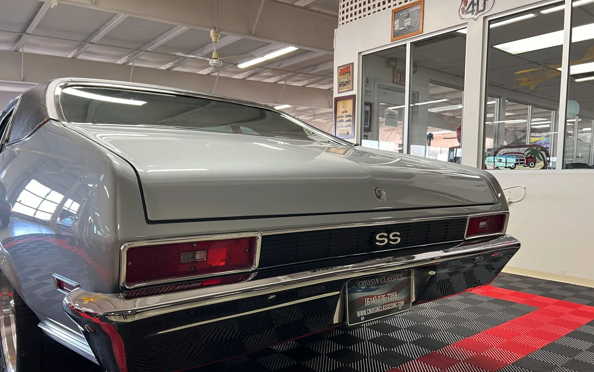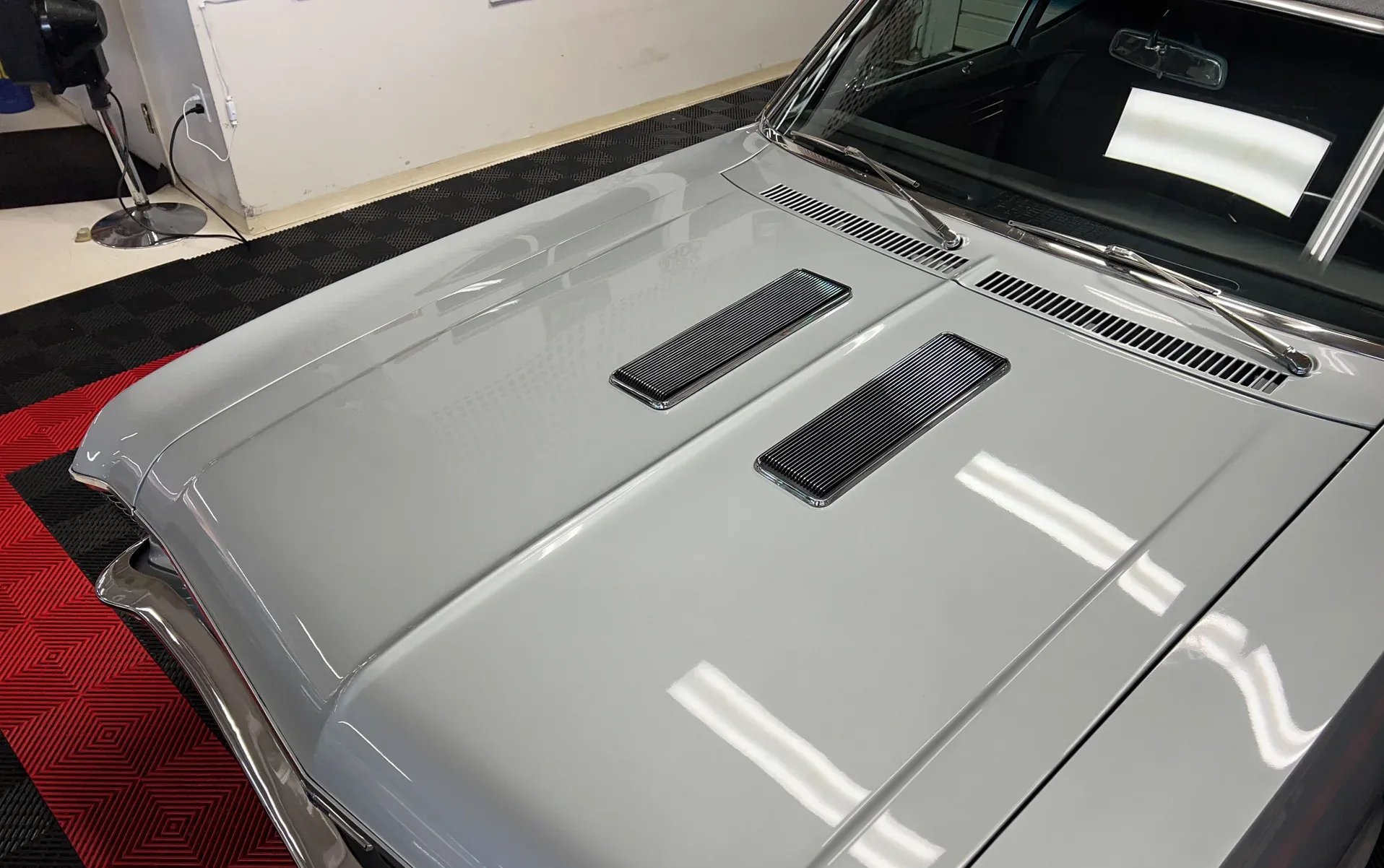 High-gloss Silver paint · Black vinyl top · Full frame-off rotisserie restoration · New chrome, trim, glass & bumpers · American Racing 18” front / 20” rear wheels · Falken radial tires · Lowered stance