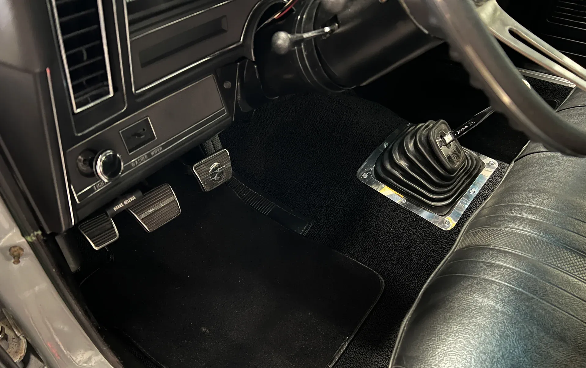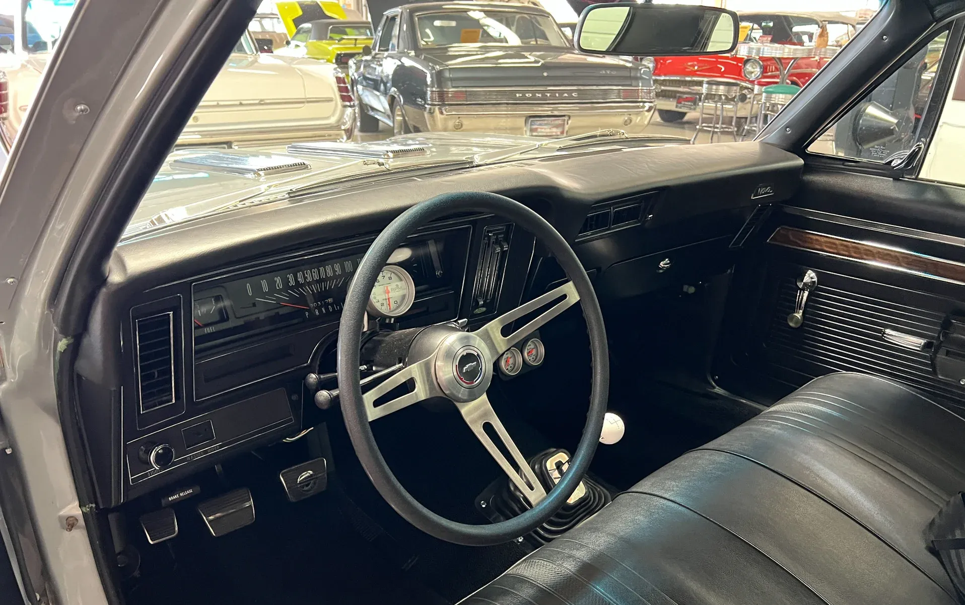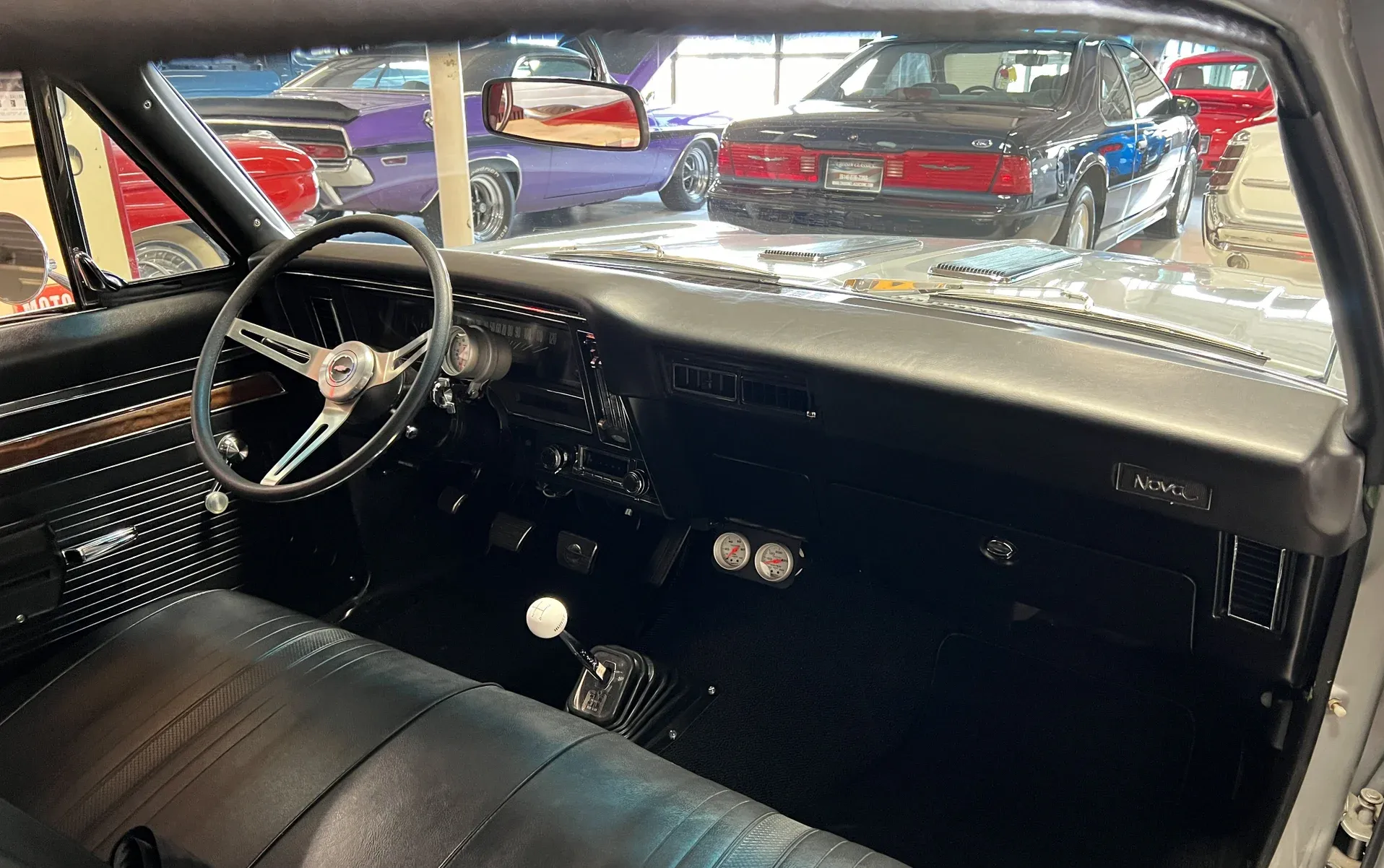 New black vinyl interior · Bench seat · Autometer gauges · Tilt steering column · Vintage A/C (ice cold) · Tight headliner · Seat belts front & rear